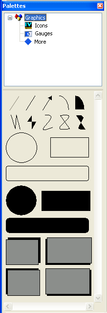 The Palettes panel provides you with predefined gadgets and graphics that you can drag and drop directly to your work space to create the graphic panels that will constitute your final application. See Creating Objects.