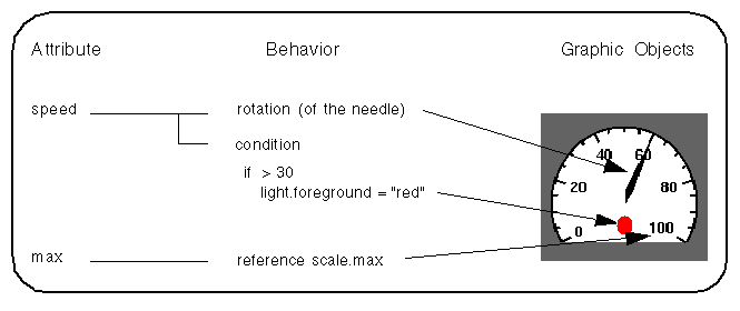 The speed attribute is implemented by two accessor objects, each having a graphic behavior: