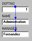 Drag a line from the DEPTNO text field object to the NAME text field object. When the NAME object becomes highlighted, release the mouse button.