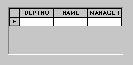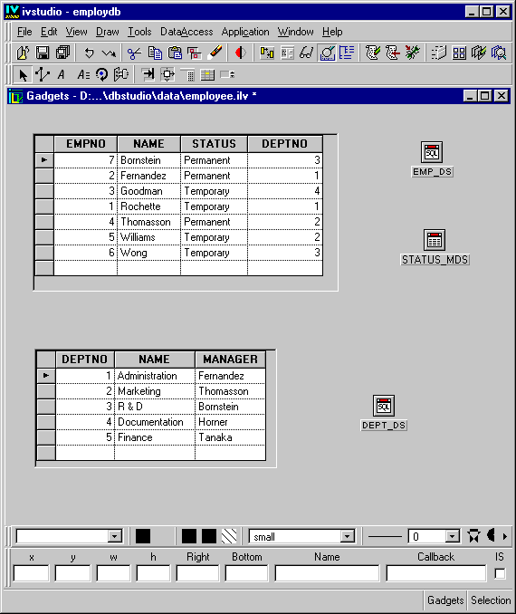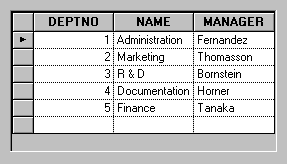 The columns in the table gadget in the Main window change to match those of the DEPT_DS data source table.