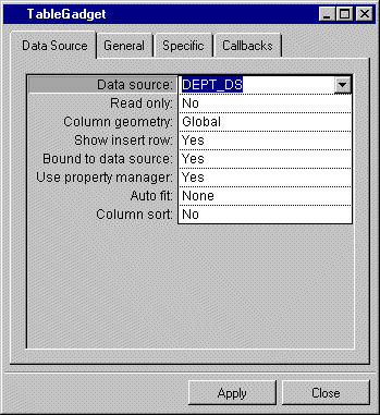 Use the combo box to enter DEPT_DS in the Data source cell of the Table Gadget inspector. Click Apply.