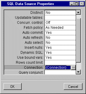 For example, you can use the Name field of the Connect panel to select a connection to a database. You would use this field instead of filling out the other fields of the Connection panel. The current data source can thus immediately make use of this predefined SQL session: