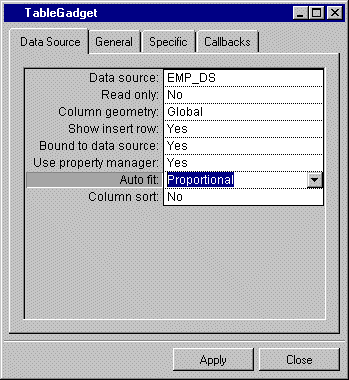When the table gadget is resized, its columns need to be resized proportionally with it. In the Table Gadget inspector, use the combo box menu to change the Auto Fit field to Proportional. Click Apply.