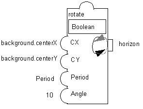 The Angle parameter specifies the number of degrees by which the object rotates at every timer tick. The Center X and Center Y parameters define the rotation center. You should not use the center of the rotating node itself for these parameters because the rounding problems that occur while rotating an object might move it slightly. Instead, you should use the center of another fixed object of the prototype. You can make this reference object invisible if necessary.