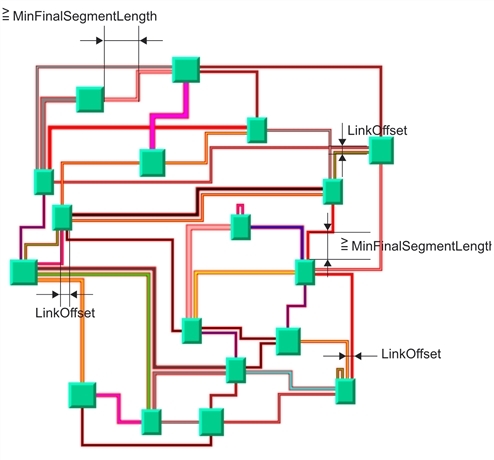 The layout algorithm computes the final connecting segments of the links (that is, the segments near the origin and destination nodes) in order to obtain parallel lines spaced at a user-defined distance. Since the links can have different widths, it takes into account the width of the links, when computing the offset. To specify the offset, use the method: