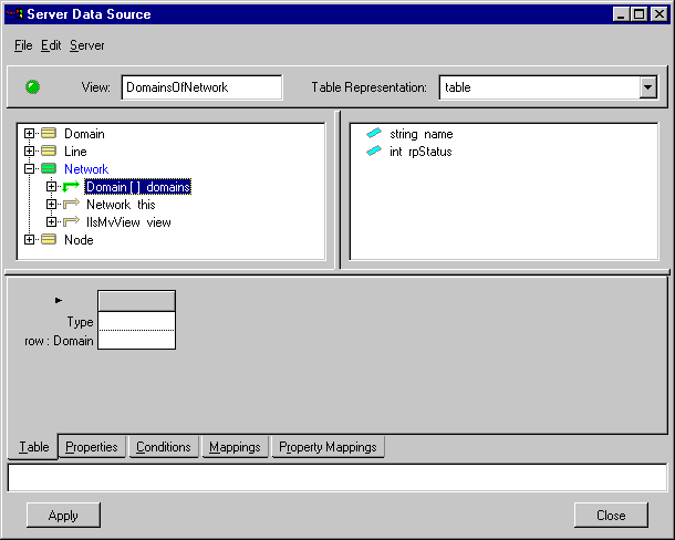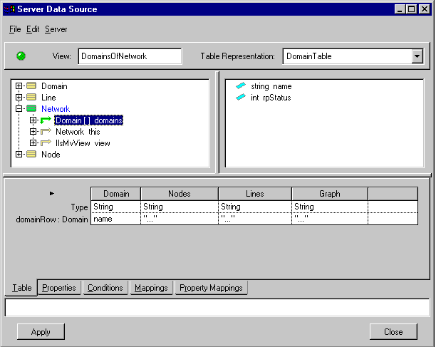 The Main data source table is composed of two kinds of representation objects: the table itself, and its associated rows. In this example, the table represents a network and the rows represent the domains owned by the network.