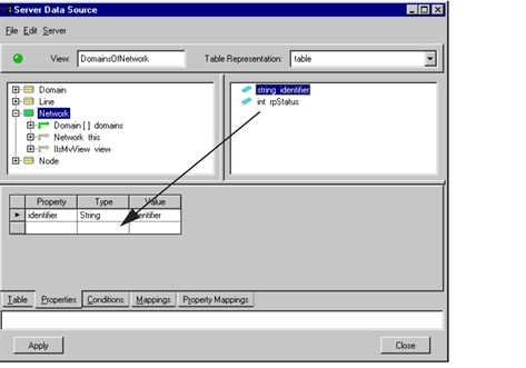 This data source table lets you define properties that apply to its associated server class, Network. These attributes will be accessible from the application component without being inserted into the Main table. An example of this would be to put the network name into the Properties table so that it can be attached to a label in the application component.