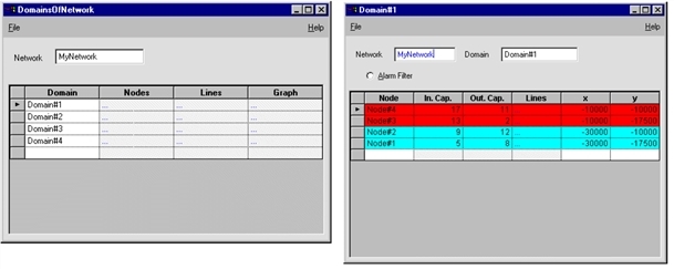 The Network application presented in is composed of five panels that display a network from various viewpoints. These panels are graphical representations, designed with Server Studio, of different views of the same underlying