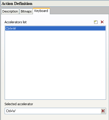 Accelerators list: To add an accelerator click the Add button and use the ‘Selected accelerator’ field, for example ‘Ctrl+W’ is added as a default first accelerator.