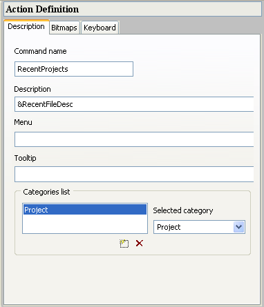 Bitmaps tab shows characteristics of the bitmap icon associated with the action. This icon appears in the menu, toolbar, and tree lists with the action name.