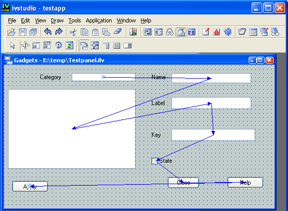 For each focusable object (graphic object that can receive the keyboard events), you can specify its next focus object. To do so, drag a line from that object and release the mouse button when the line is on the object you want to be the next focus object. This operation only works for focusable objects.