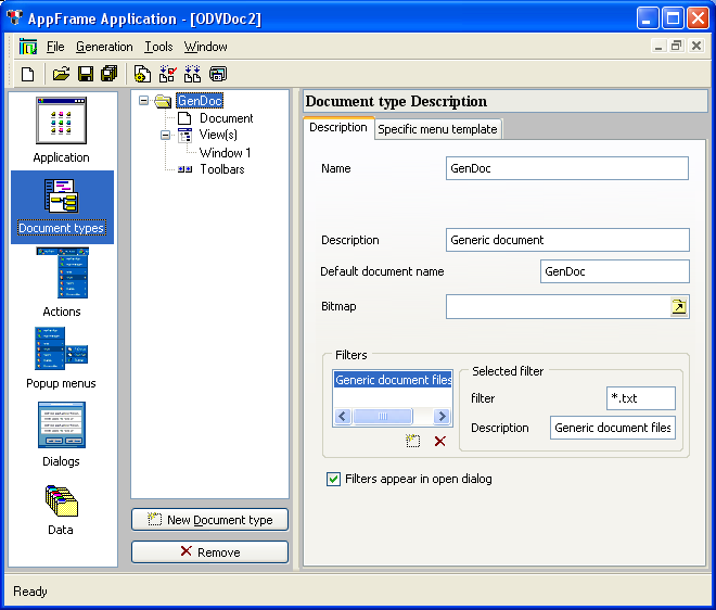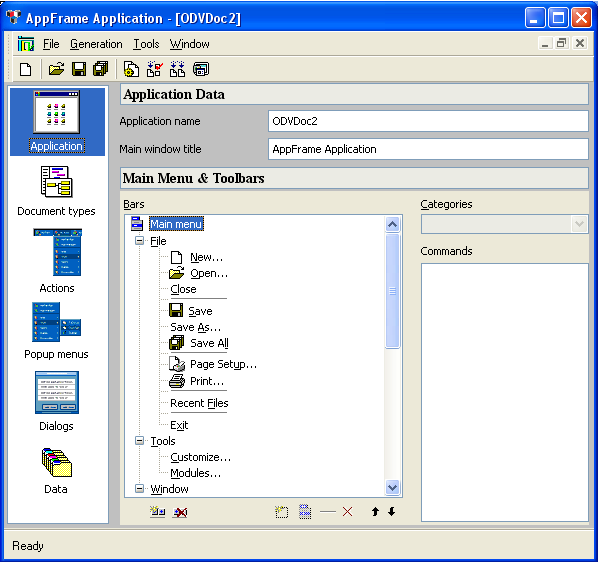 The Application Framework Editor opens a new .odv file and displays several windows. The left area lets you select the application entity you are editing (Application, Document types, Actions, Popup menus, and Data), whereas the right area lets you set the parameters of the selected entity: