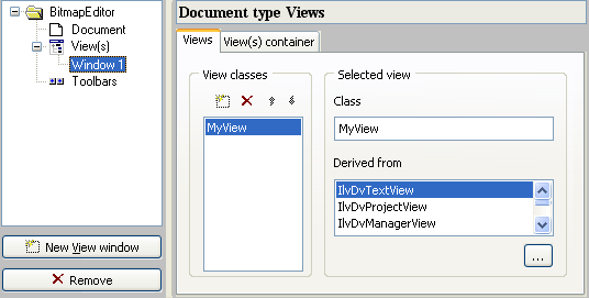 There is now a bitmap in the Bitmap Editor document and it needs to be displayed in a document view. From the predefined document views proposed by Application Framework, none allow you to display a bitmap. Therefore, select IlvDvFormView, which is a generic class allowing you to load Views files (.ilv).