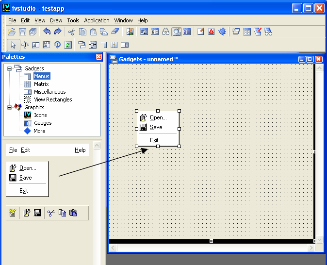 To insert a pop-up menu (IlvPopupMenu) in the workspace: