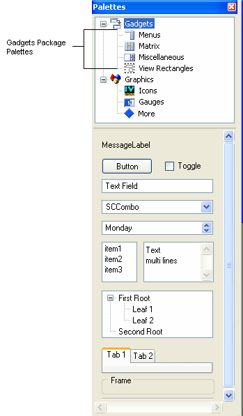 When you use the Gadgets extension of Views Studio, you have access to additional predefined gadget objects through the Palettes panel. You will use the gadgets in the Palettes panel just in the same as you do with the Foundations package of Views Studio. You create the objects in the workspace either using the drag-and-drop operation or the creation mode operation.