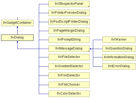 The Gadgets library provides the IlvDialog class that you can use to create dialog boxes. Since this class inherits from IlvGadgetContainer, its instances can contain gadgets. IlvDialog has various subclasses that implement standard dialog boxes.