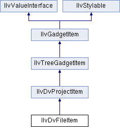 IlvDvFileItem is a subclass of IlvDvProjectItem. It references a file using an IlvDvFileInfo object. When this file item is activated in a project view, the project document opens a document for the file associated with the file item.