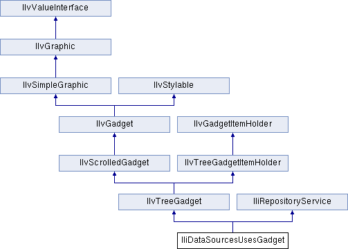 The IliDataSourcesUsesGadget class defines a tree gadget class, which can display up to three levels of information for each valid data source of the application. The levels are: