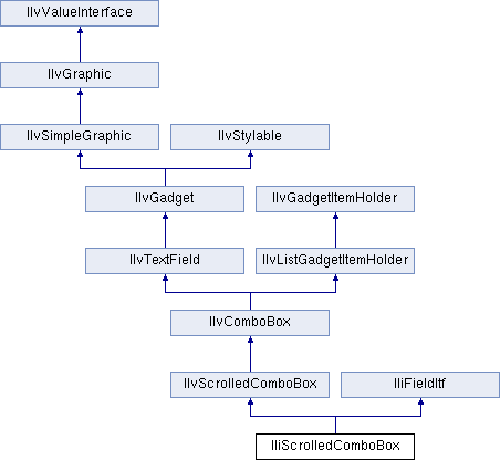 The IliScrolledComboBox class defines a combo box gadget that opens a pull-down menu when the user clicks on the combo button. The pull-down menu displays a column of the foreign table of the field. A IliScrolledComboBox gadget inherits the following properties from the IliFieldItf class: