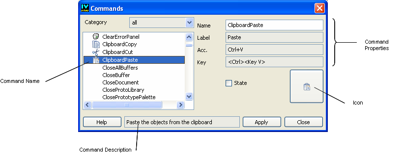 State Shows the Boolean state of a command. A Boolean state is useful when the command action changes the state of something. For example, commands that select editing modes have their state modified when the associated modes are selected or deselected. When the state of the command is true, the State button appears inverted.