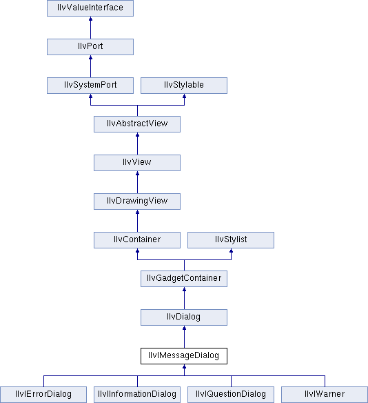 The IlvIMessageDialog class asks the user a question and expects a yes or no answer. IlvIMessageDialog has predefined subclasses for questions (IlvIQuestionDialog), warnings (IlvIWarner), errors (IlvIErrorDialog), and information (IlvIInformationDialog). The names of the graphic object are displayed to let you modify the default look of the dialog box.