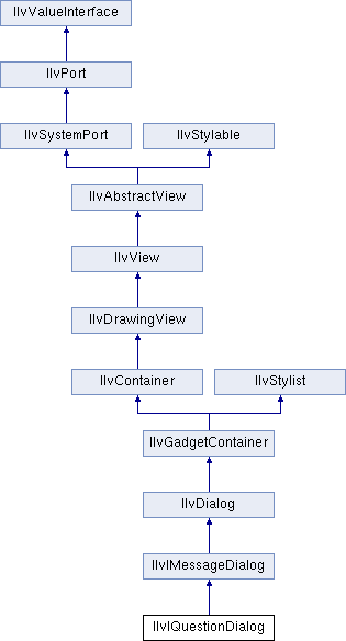 The IlvIQuestionDialog class displays a question, and expects a yes or no answer. The names of the graphic objects are displayed to let you change the default look of the dialog.