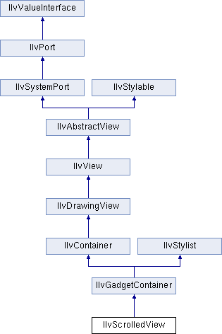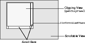 The IlvScrolledView class is a predefined gadget container class that lets you create scrolled views. This class builds the necessary view hierarchy to create a window with scroll bars. Once you have created an IlvScrolledView, you add the scrollable view as a subview of the clipping view of this object. The logical representation of the hierarchy looks like this: